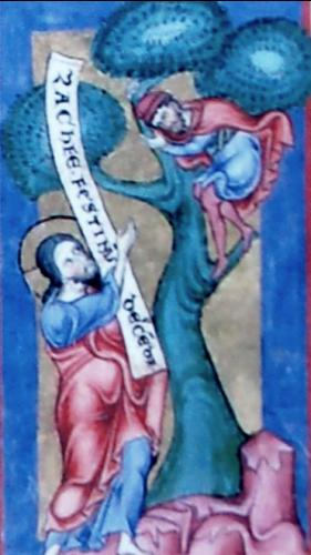 Zurückzuführen ist diese Gestalt auf den kleinwüchsigen Oberzöllner Zachäus aus Jericho. Im Lukasevangelium (Lukas 19 1-10) wird beschrieben, wie dieser auf einen wilden Maulbeerfeigenbaurn klettert, damit er den vorbeiziehenden Jesus besser sehen konnte. Jesus hielt an und forderte ihn auf, eilends vom Baum zu steigen, da er, der Verachtung der ehrbaren Bürger zum Trotz, beabsichtigte, bei ihm einzukehren. Zachäus kletterte herunter, blieb mit seinem Gewand jedoch am Baum hängen. Somit verbindet man mit Zachäus sowohl eine biblische Gestalt als auch einen Possenreiter. |
