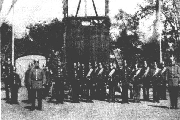 Die damalige Mannschaft der Holtorfer Feuerwehr und ihr Steigerturm auf dem Feuerwehrplatz (heute: Guardinistraße 31)
