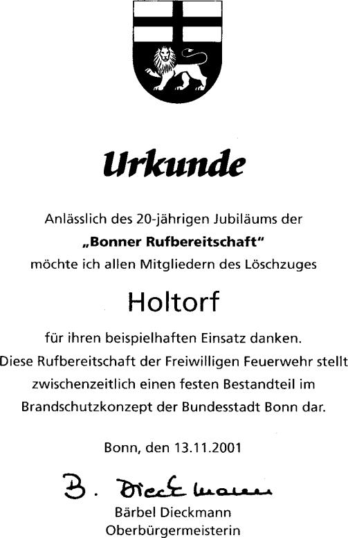 Wir rufen daher die jungen Holtorfer auf, die Möglichkeit einer aktiven Mitgliedschaft in der Freiwilligen Feuerwehr Holtorf in Erwägung zu ziehen. Ein besonderer Appell geht an die jungen Frauen. Der Löschzug Holtorf ist einer von ganz wenigen im Raum Bonn, dem sich noch keine Frauen angeschlossen haben. Manfred Mölders, der Leiter des Löschzuges hat versichert, dass die erste Frau, die Mitglied der Holtorfer Feuerwehr wird, einen großem Empfang mit Blumen und Presse bekommt.