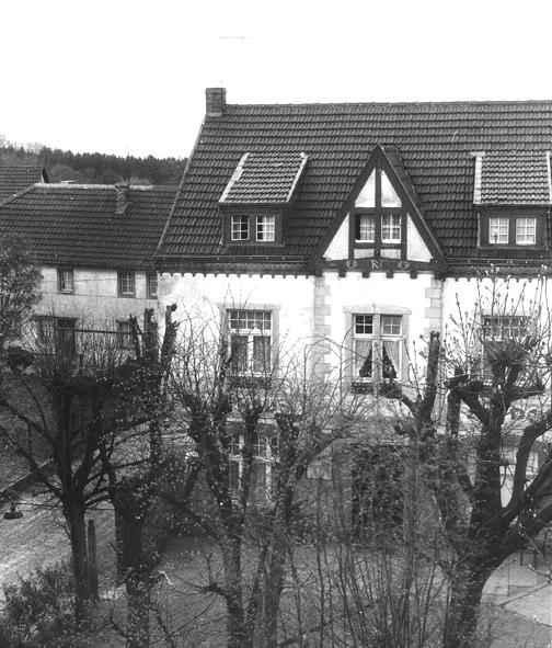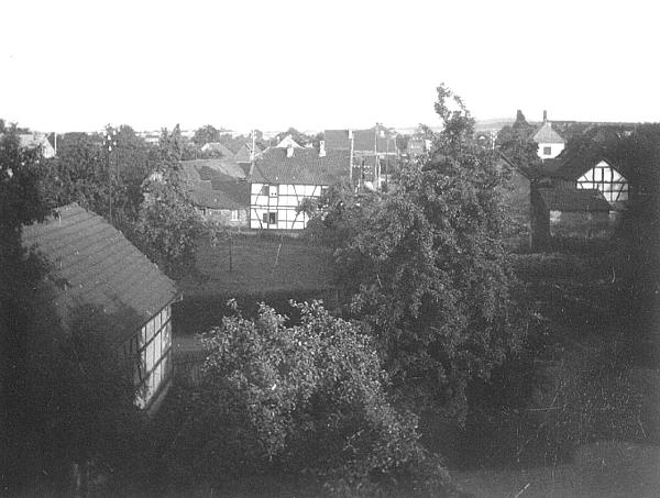 Im Vordergrund sieht man das damalige "Gasthaus zur Post". Links daneben verläuft der Tränkweg. Zu sehen ist auch eins von damals vier Häusern an dieser Straße: