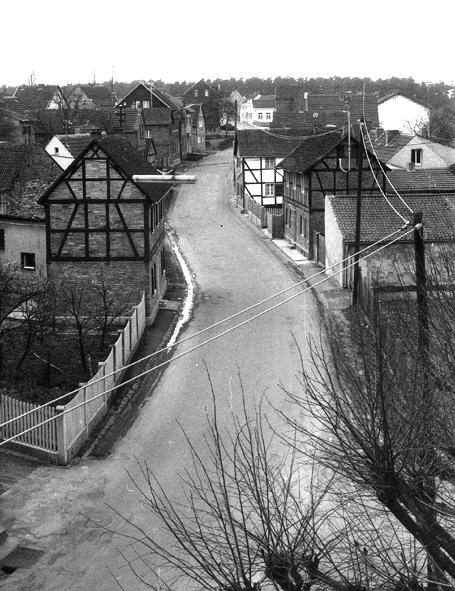 Dieses Bild zeigt die damalige Hauptstraße ab dem Tränkweg in nördlicher Richtung. Die alten Fachwerkhäuser waren direkt an die Straße gebaut, es gab keinen Bürgersteig. Die Abwässer liefen teilweise noch durch die Gosse: