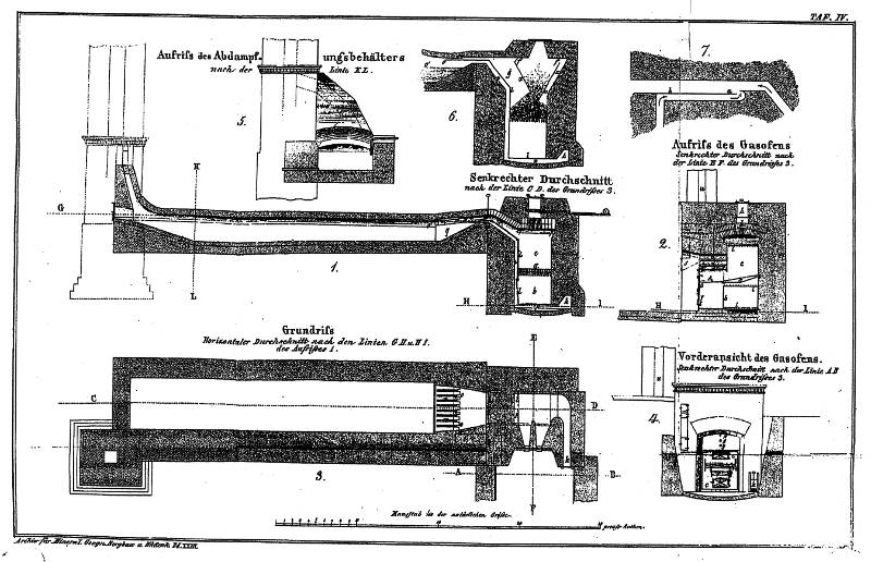 In dieser Halle befand sich, wie Dr. Hermann Bleibtreu in dem Jahrbuch für Bergbau, Mineralogie und Hüttenkunde, Berlin 1850 schildert, ein aus Backsteinen mit hydraulischem Mörtel construier tes Laugenbassin von ca. 50 Fuß Länge (12,80 m) ca. 7 Fuß Breite (2,24 m) und 2 Fuß Tiefe (0,64 m). Dasselbe war mit einem flachen Gewölbe umspannt, damit die Flamme dicht über dem Spiegel der Flüssigkeit herziehen musste. Zum Abzug der Verbrennungsprodukte und Wasserdämpfe war am äußersten Ende eine ca. 70 Fuß (ca. 20 m) hohe Esse erbaut worden. Die Flamme wurde von einem außerordentlich komplizierten Flammenofen (s. Abb. Anhang) an der Vor derfront des Beckens erzeugt. Dieser ganze Vorgang wird von Dr. Hermann Bleibtreu in seiner be reits erwähnten Schrift im einzelnen beschrieben und gezeichnet.