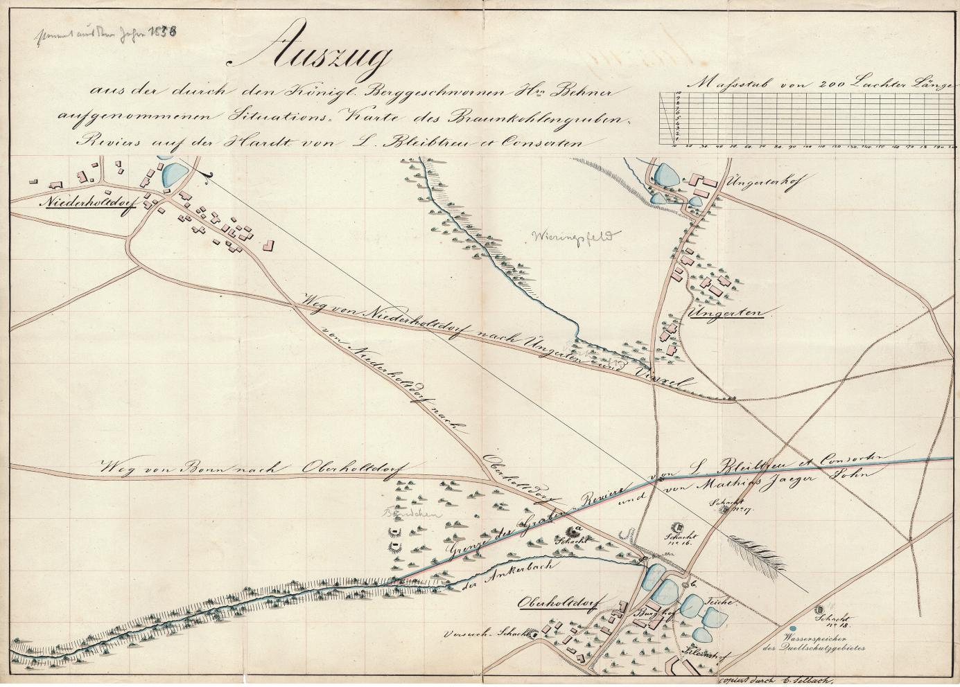 Auf der genannten Stollenkarte, wie auch auf der Preuß. Uraufnahme, ist ersichtlich, dass große Flächen bis hin zur Oberkasseler Straße unbewaldet waren und landwirtschaftlich genutzt wurden.Diese Flächen sind erst später infolge der gravierenden Bodenumwälzungen durch den Braunkohleabbau aufgeforstet worden.