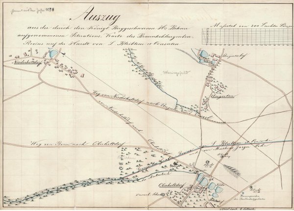 Einige Schreiben - natürlich alle in Sütterlinschrift transkribierte mir freundlicherweise Franz Meurer. Den weitaus größten Teil der Unterlagen übergab ich jedoch einem befreundeten ehemaligen Oberschulrat zur Transkription und Einordnung. Dies alles geschah im Einvernehmen mit Daniel von Hagens, der zeitlich nicht in der Lage war, diese gewaltige Aufgabe zu übernehmen. Übertroffen wurden diese Fundstücke für unsere Heimatgeschichte jedoch durch eine Stollenkarte mit einer Größe von 35 x 42 cm. (s. Abbildung). Nach den eingezeichneten Schächten zu urteilen, handelt es sich offensichtlich um eine Darstellung der Stollensituation um das Jahr 1838.