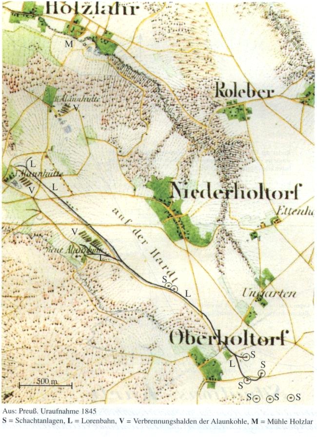 Hier ist der Fortgang des Abbaus in dem dargestellten Kohlefeld Deutsche Redlichkeit während der vergangenen sieben Jahre durch die Eintragung weiterer drei Schächte im südlichen Teil deutlich zu erkennen. Die Grenze zwischen den Unternehmen von Bleibtreu und Jäger & Sohn, dem Betreiber des Werkes an der Fuchskaule, ist hierbei blau-rot gekennzeichnet.