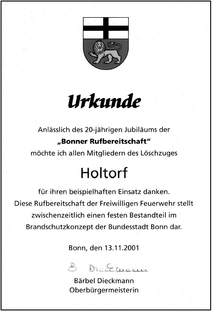 Am 1. Juli 1999 verabschiedeten sich im Alten Rathaus die Verfassungsorgane (Bundespräsident, Bundesratspräsident, Bundeskanzler u.a.) aus der Bundesstadt Bonn. Die Freiwillige Feuerwehr Bonn bildete ein Ehrenspalier, der Löschzug Holtorf war ebenfalls beteiligt.