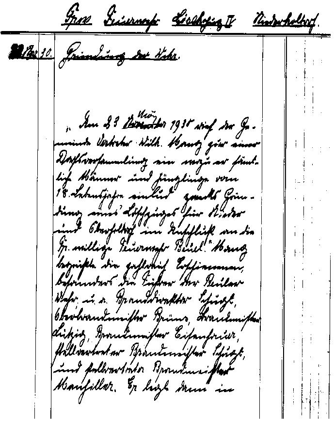 "Am 23. Mai 1930 rief der Gemeindevertreter Wilhelm Mang zu einer Dorfversammlung auf, zu der er sämtliche Männer und Jünglinge vom 18. Lebensjahr an einlud zwecks Gründung eines Löschzuges für Nieder- und Oberholtorf im Anschluss an die Freiwillige Feuerwehr Beuel."
