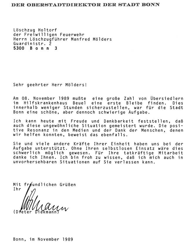 Im November des gleichen Jahres musste der Löschzug wieder einmal zu einem Einsatz "der anderen Art " ausrücken. Eine größere Zahl von DDR-Aussiedlern war auf der Fahrt nach Bonn. An einem Abend gegen 21.00 Uhr bat die Feuerwehrleitstelle um Unterstützung bei der Herrichtung von Schlafmöglichkeiten in der Turnhalle der Gesamtschule Beuel.