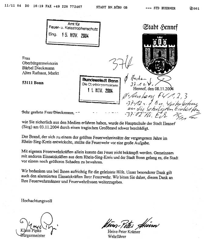 Den Kommunalpolitikern unserer Stadt Bonn sei zu empfehlen, stets ein offenes Ohr für die Belange der Freiwilligen Feuerwehr zu haben!