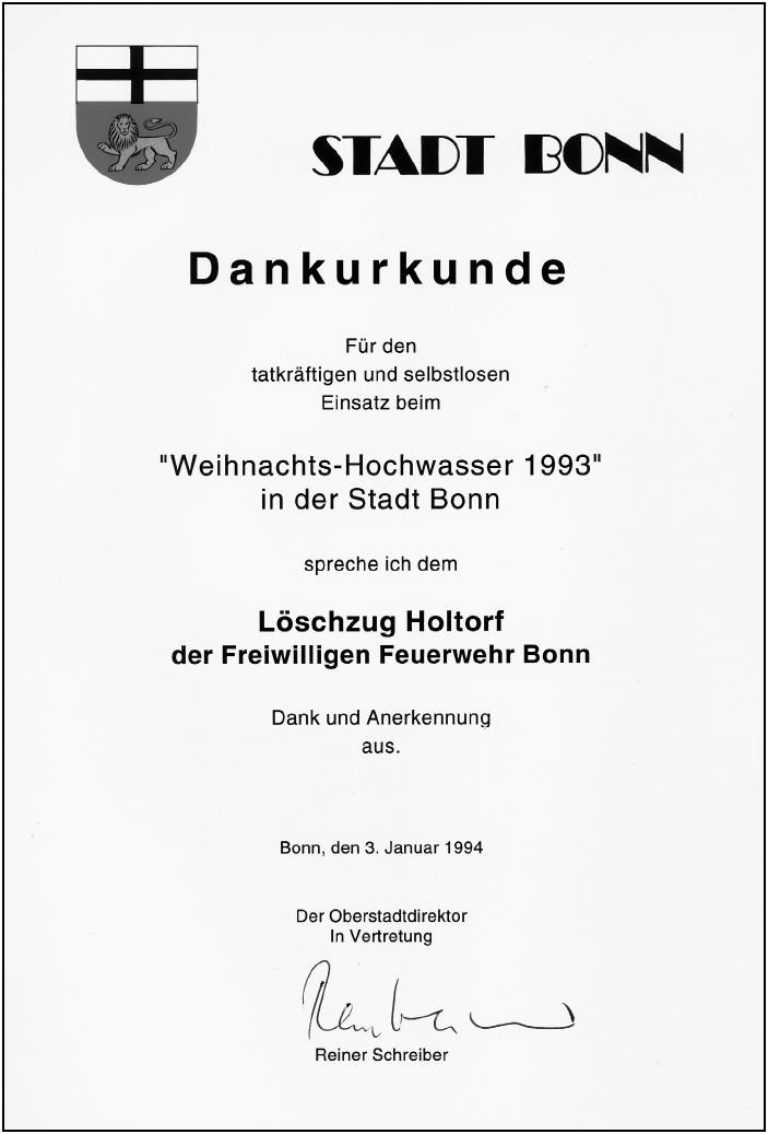 Ein Hochwassereinsatz soll noch einmal besonders herausgestellt werden. Es war der Einsatz beim sogenannten "Weihnachtshochwasser" im Jahre 1993. Weihnachten fiel für Löschzüge buchstäblich ins Wasser. Die Versorgung der im Hochwasser eingeschlossenen Bevölkerung hatte absoluten Vorrang. Die Menschen haben diesen Einsatz der Beueler Löschzüge mit großer Dankbarkeit zur Kenntnis genommen. Sie konnten sich auf ihre Feuerwehr verlassen, für viele war das an diesen Tagen wohl das größte Geschenk.