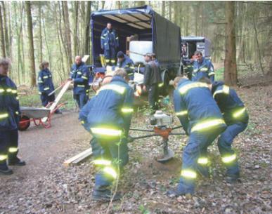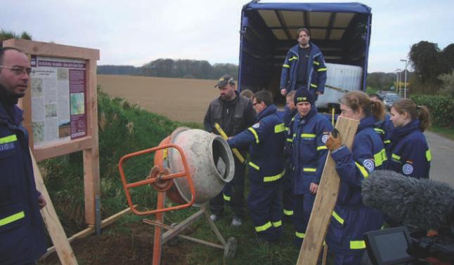 Vor dem Aufstellen wurden die Standorte genau von Georg Divossen mit dem zuständigen Förster, Herrn Sommerhäuser, im Wald gekennzeichnet, um Kollisionen mit forstwirtschaftlichen und Naturschutz-Belangen zu vermeiden. Das Aufstellen erfolgte dann kostenlos durch das Technische Hilfswerk (THW) am Samstag, 22. März. Es war sehr beeindruckend zu sehen, wie professionell die Truppe des THW-Ortsverbandsvorsitzenden Michael Thielges unter der Fachbauleitung des Zimmerermeisters, Herrn Boelicke, die Aufstellung vornahm. Die Bürgervereine sorgten für die Mittagsbewirtung der arbeitenden THW-Truppe am Hardtweiher.